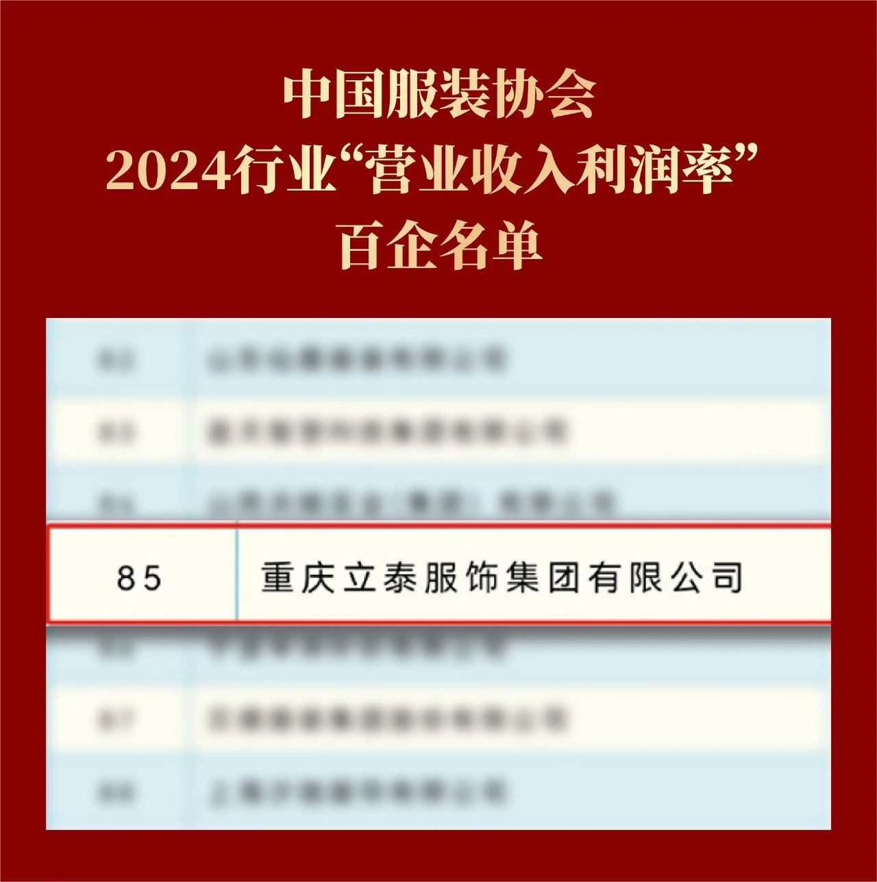 重慶立泰服飾集團(下稱“立泰集團”)入選中國服裝協會2024行業“營業收入利潤率”百企名單,成為重慶市服裝行業唯一上榜企業,充分展現了立泰集團強大的綜合實力。